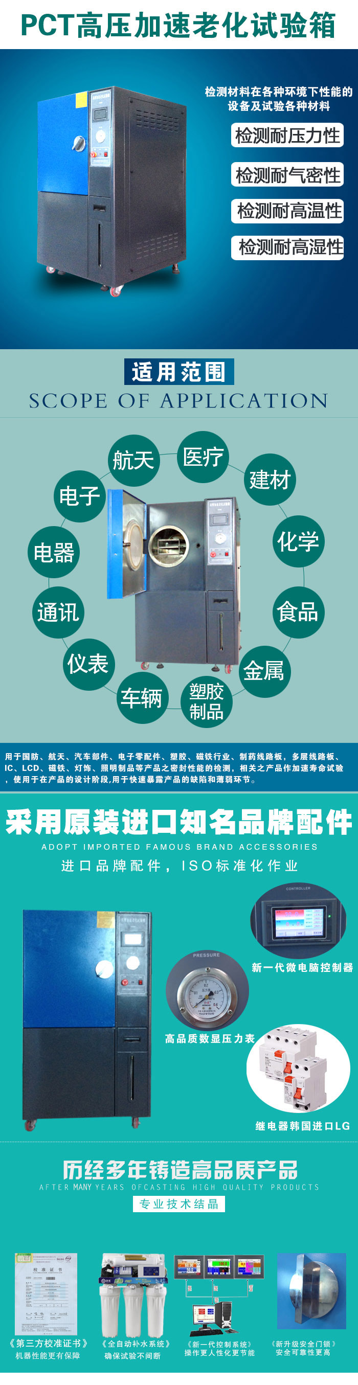 | 產品用途:高壓加速老化試驗箱適用于國防、航天、汽車部件、電子零配件、塑膠、磁鐵行業、制藥線路板,多層線路板、IC、LCD、磁鐵、燈飾、照明制品等產品之密封性能的檢測,相關之產品作加速壽命試驗,使用于在產品的設計階段,用于快速暴露產品的缺陷和薄弱環節。測試其制品的耐厭性,氣密性。 | |