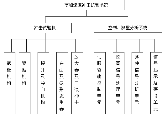 高加速度沖擊試驗系統由沖擊試驗機、控制測量分析系統組成,組成框圖見圖2.1.2-1。