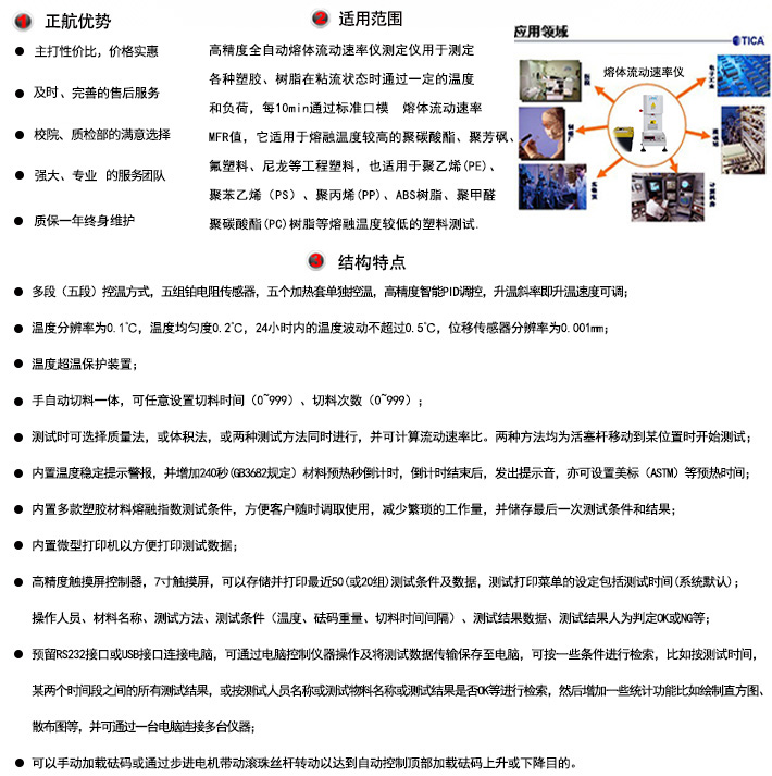 | 產(chǎn)品用途: 用于測定各種塑膠、樹脂在粘流狀態(tài)時通過一定的溫度和負荷,每10min通過標準口模熔體流動速率MFR值,它適用于熔融溫度較高的聚碳酸酯、聚芳砜、氟塑料、尼龍等工程塑料,也適用于聚乙烯(PE)、聚苯乙烯(PS)、聚丙烯(PP)、ABS樹脂、聚甲醛(POM)、聚碳酸酯(PC)樹脂等熔融溫度較低的塑料測試,廣泛地應(yīng)用于塑料生產(chǎn),塑料制品、石油化工等行業(yè)以及相關(guān)院校、科研單位和商檢部門。 | |